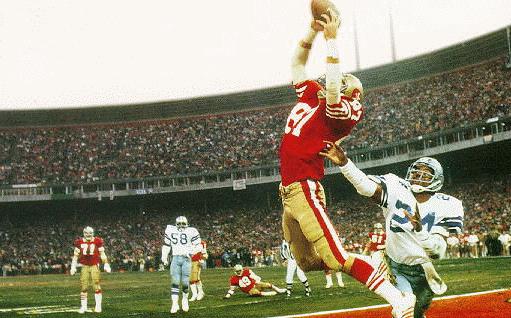 I am the BIGGEST 49er fan there is. This is a picture of Dwight Clark's catch that helped us beat the Cowboys and eventually win our first Super Bowl. It was a great day to be one of the 49er Faithful. |